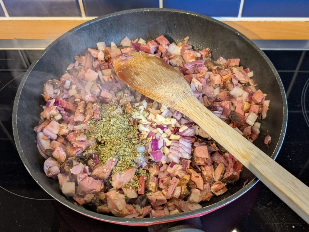 Für die Schinekenfleckerl in der cremigen Variante hackt man die Zwiebel und den Knoblach klein und schwitzt beides in einer Pfanne an. Danach kommt der würfelig geschnittene (Oster-)Schinken dazu. Man würzt mit Majoran (dem wohl burgenländsichsten aller Gewürze), Salz – allerdings nicht zu viel da das Ostergsöchte ja schon salzig an sich ist – und Pfeffer.