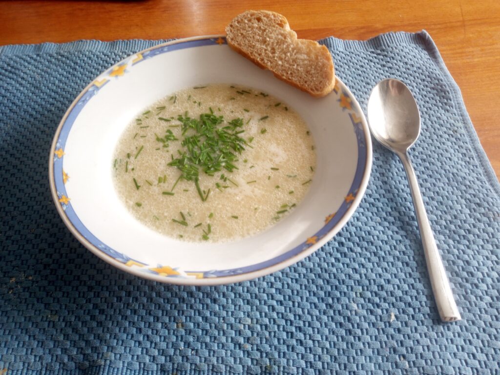 Die ultimative Krönung dieser Suppe ist der frisch gehackte Schnittlauch. Mit einer Scheibe Schwarzbrot (auch gerne zum Einbrockn) wird serviert.