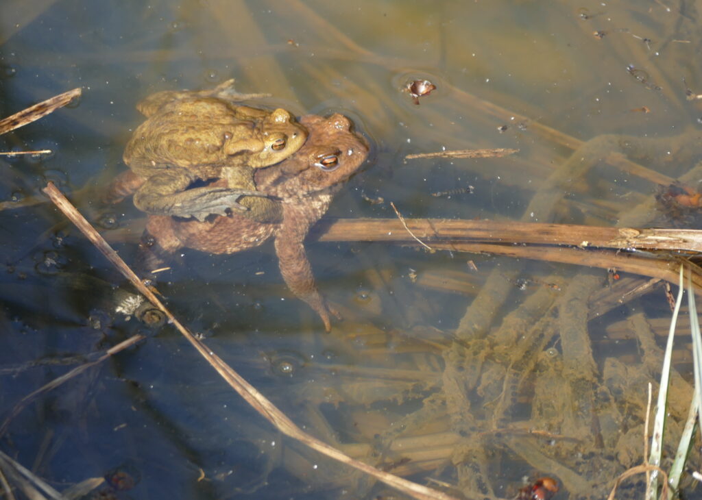 Erdkrötenpärchen auf dem Weg zum Ablaichen. Rechts im Bild sind lange und mit Algen „getarnte“ Laichschnüre zu sehen.