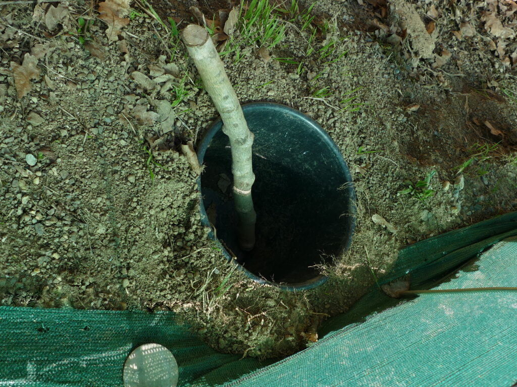 Ein eingegrabener Kübel nahe am Zaun mit kleinen Löchern, damit Wasser nach Regenfällen versickern kann abrinnt, und einem Holzstück als Ausstieghilfe für Mäuse, Eidechsen, Insekten und Spinnen.