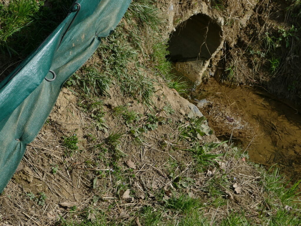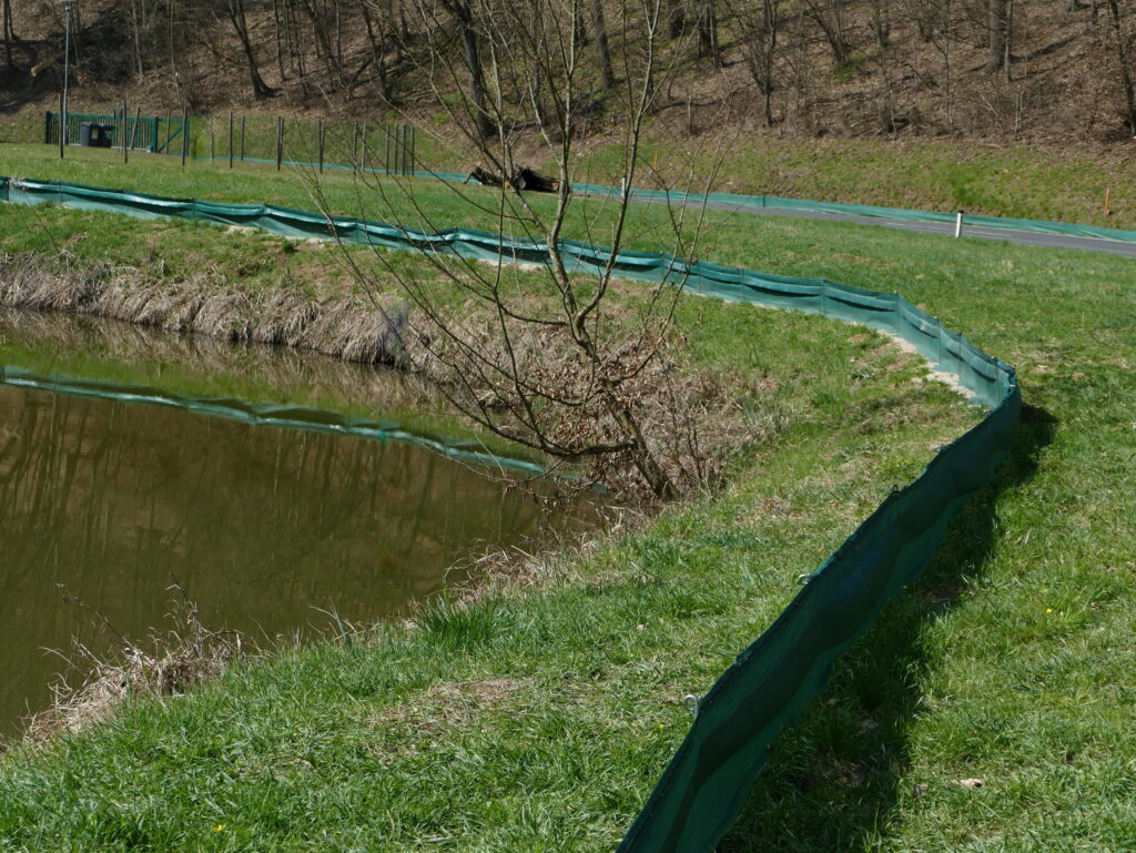 Der u-hakerlförmig aufgestellte Rückwanderzaun leitet die die Amphibien direkt zum Durchlass. Im Hintergrund der Zuwanderzaun mit Kübeln direkt an der Straße.