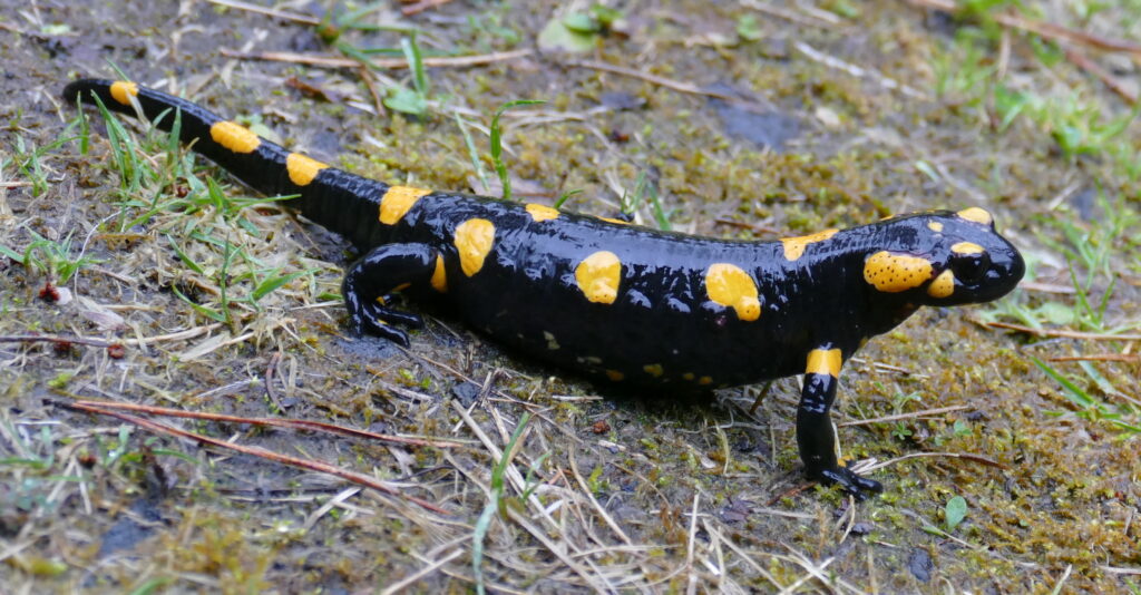 Prall gefüllt mit Larven ist das Feuersalamanderweibchen am Weg zum Laichgewässer.
