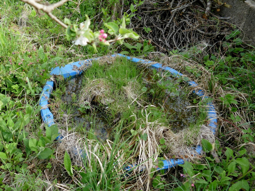 Wir haben die ausgediente Sandmuschel unserer Enkelkinder zu Wassermuscheln als Laichgewässer an einem halbschattigen Platz neben einem Apfelbaum für Unken umfunktioniert. Die abgenommenen Grasnarbenstücke können zwischengelagert und später zum Abdecken des fertig angesetzten Komposthaufens verwendet werden. Die ausgehobene Erde wird kompostiert. Die in die flache Mulde eingesetzte Muschel wird mit Wasser gefüllt und in der Mitte mit einer Insel bestückt, die aus einem mit einigen Grasnarbenstücken beschwerten, stärkeren Ast besteht und eine teilweise Verlandung ermöglicht.