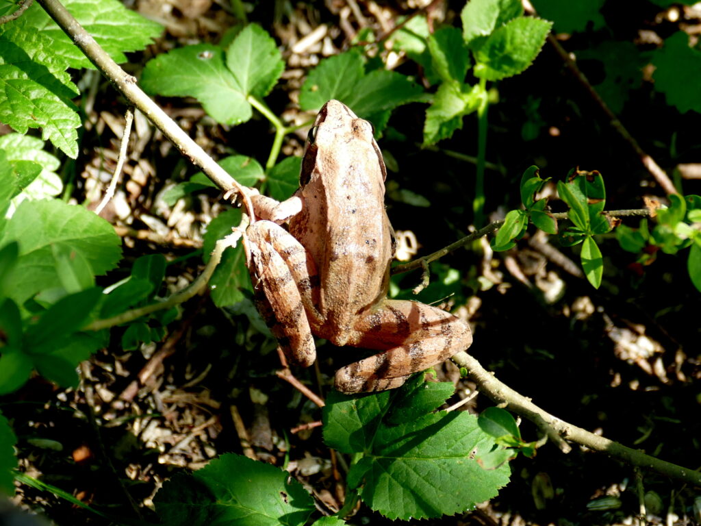 Der Springfrosch ist in den Morgenstunden in unserem Garten zum Sonnenbad auf einen dünnen Ast in Bodennähe geklettert.