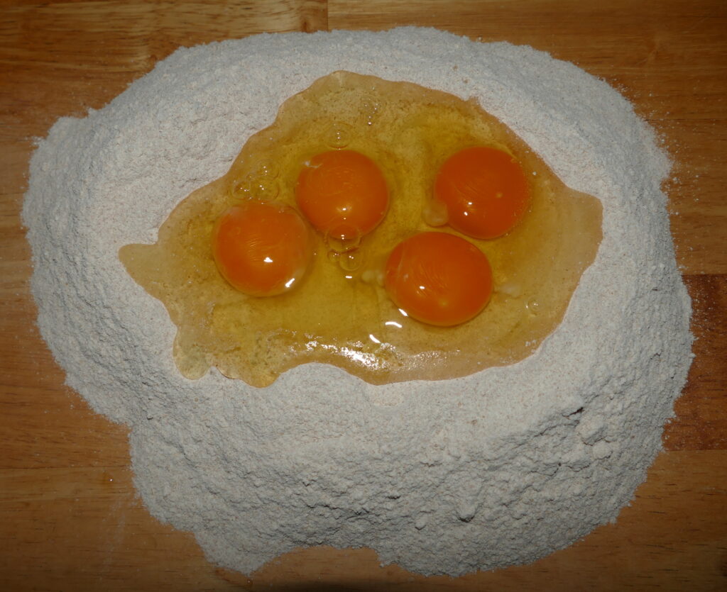 links: die Zutaten für den Fleckerlteig werden vorbereitet; rechts: der Teig wird wie oben beschrieben zu Fleckerl geradelt.