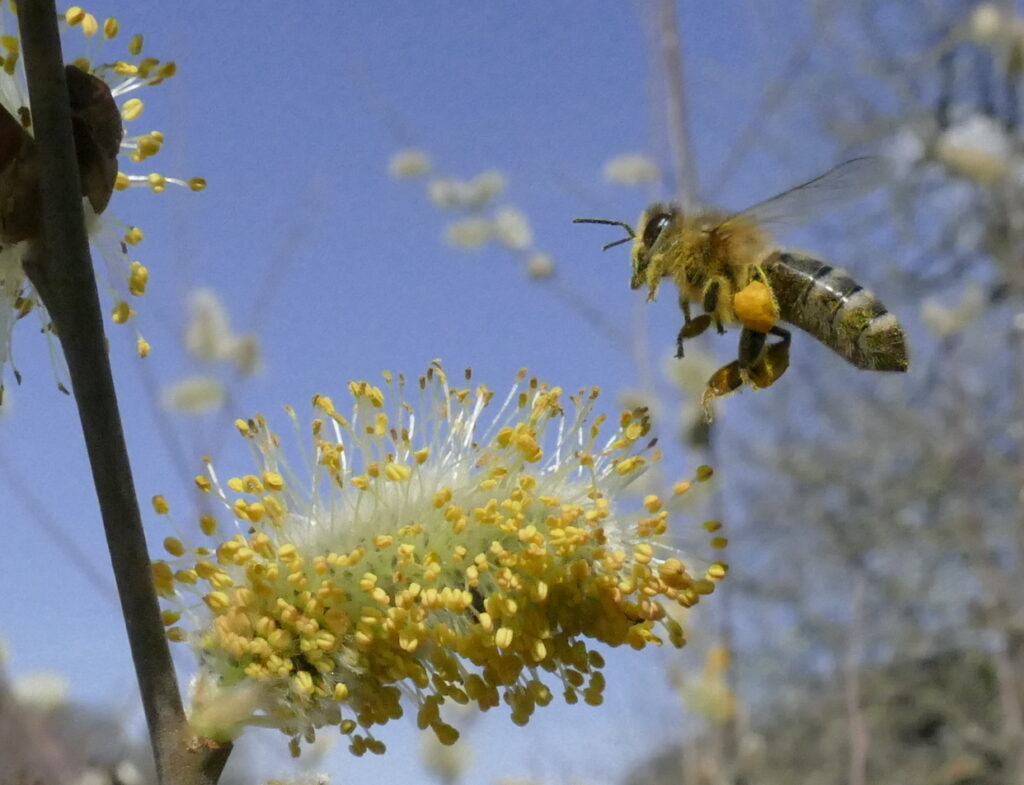 Eine Honigbiene im Anflug auf ein Palmkätzchen.