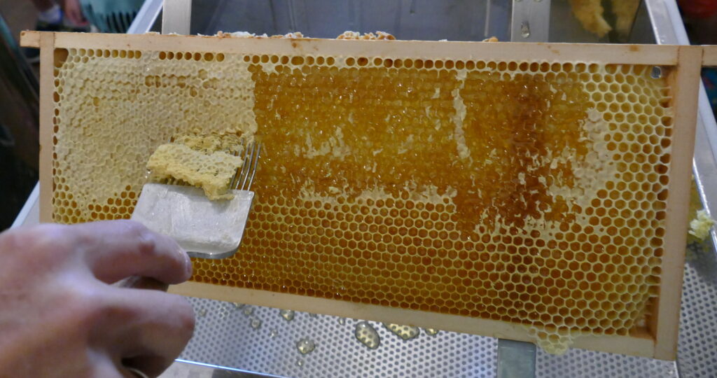 Die Honigwaben werden entdeckelt, damit der Honig geschleudert werden kann.