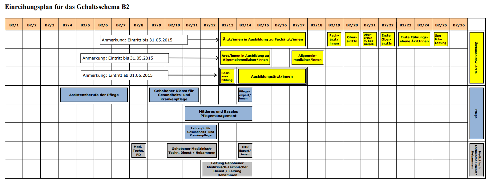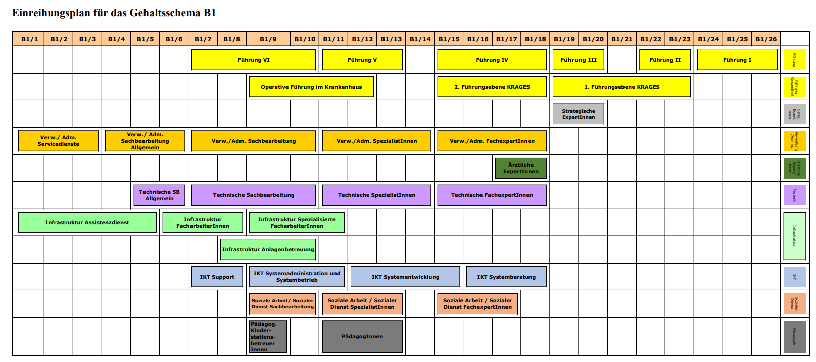 Beide Schemata verwenden die gleichen 26 Gehaltsbänder, unterscheiden sich aber in der absoluten Höhe und Progression der Monatsgehälter, um zum einen die Binnenlogik der Verwaltung (B1) und zum anderen die Arbeitsmarktlage und besondere Verantwortungs- und Belastungsprofile in Gesundheitsberufen (B2) adäquat abzubilden. Für B2 sind zudem spezielle Elemente wie Marktzulagen für bestimmte Berufsgruppen und Gehaltsbänder vorgesehen, etwa für Pflegeberufe und Ärztinnen in höheren B2‑Bändern, um die Konkurrenzfähigkeit gegenüber Spitälern anderer Träger und dem Bundesdienst zu sichern.