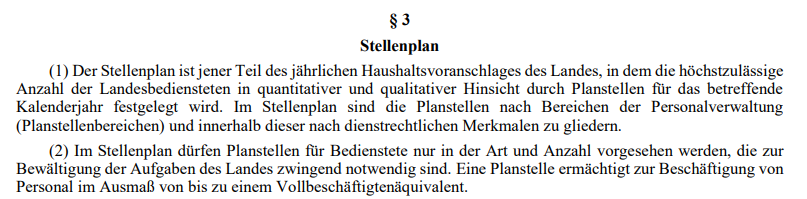 Die rechtliche Grundlage für den Stellenplan in der Landesverwaltung Burgenland ist primär das Burgenländische Landesbedienstetengesetz 2020 (Bgld. LBedG 2020, LGBl. Nr. 95/2019), das unter dem dritten Paragraph „Stellenplan“ die Erstellung und Bewirtschaftung regelt. Dieses Gesetz ordnet alle Landesbediensteten sogenannten Modellstellen zu und legt fest, dass der Stellenplan die Anzahl, Bewertung und das Beschäftigungsausmaß der Planstellen für den Gesamthaushalt (Hoheitsverwaltung, Lehrerinnen, Anstalten) bestimmt, wobei nur planmäßige Stellen finanziert werden dürfen. Ergänzend gilt die Voranschlags- und Rechnungsabschlussverordnung 2015 (VRV 2015), die den Stellenplan als obligatorischen Bestandteil des LVA für alle Bundesländer vorschreibt und dessen Gliederung (allgemeiner/besonderer Teil, Funktionsgruppen, Gehaltsbänder) detailliert.