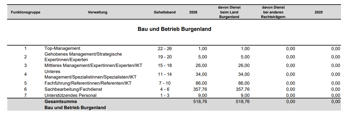 Der Stellenplan 2026 für „Bau und Betrieb Burgenland“ (Quelle: LVA 2026)