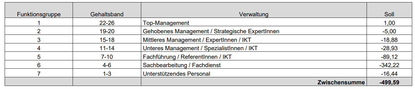 Für 2026 sind in der Hoheitsverwaltung insgesamt 2.235 Planstellen ausgewiesen, davon 2.223 in den Funktionsgruppen 1 bis 7 plus eigene Kontingente für Kindergartenaufsicht/Assistenzkindergärtnerinnen und Richterinnen. Nach Abzug budgetneutraler Planstellen ergibt sich eine Gesamtsumme von rund 2.171 Planstellen.