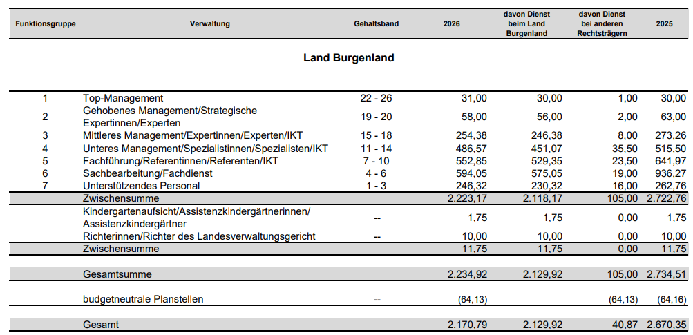 Der Stellenplan 2026 für das Burgenland (Quelle: LVA 2026)